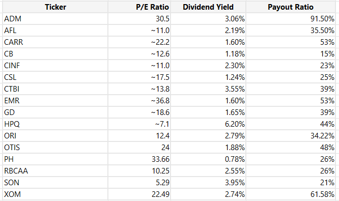 Only one that is really worrying me is ADM with a payout ratio of 91%! It has a 41 year history of dividend growth so it is my guess that the board would slow down spending before they cut the dividend. Either way it is something to keep an eye on!